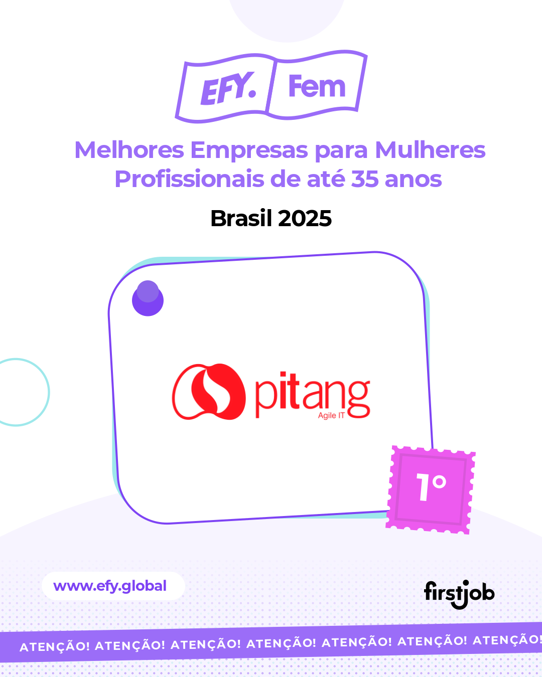 A Pitang recebeu um importante reconhecimento no cenário nacional: o 1º lugar no Ranking Público EFY FEM Brasil 2025, iniciativa da FirstJob que destaca empresas comprometidas com a promoção da equidade de gênero no mercado de trabalho.